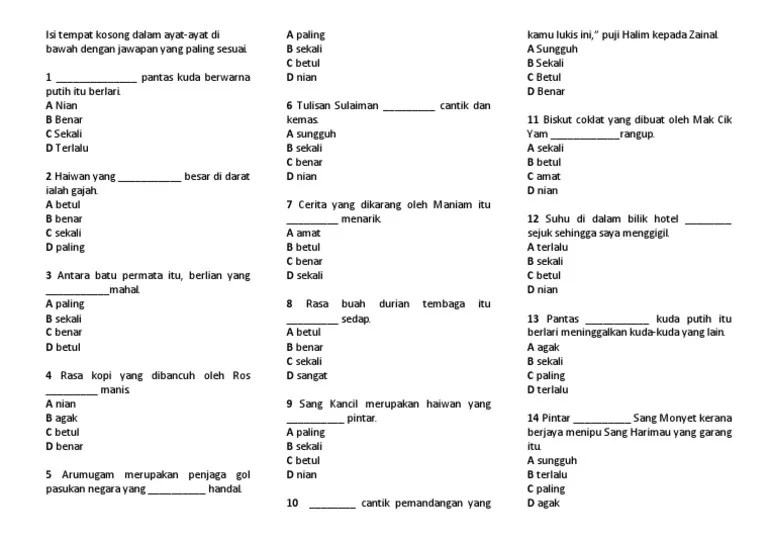 Pilih jawapan yang sesuai dengan ayat yang diberikan. Play this game to review other. Suhu di kawasan kutup amat sejuk. Soalan 19 dan soalan 20. Burung unta itu berlari ______ pantas.